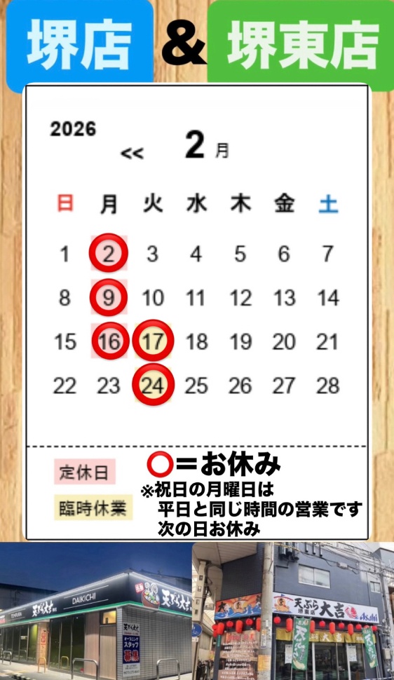 | 営業時間 | 堺店 平日、月曜日(祝日) 前日PM23:00〜PM8:00 ラスト15分前 土日 前日PM23:00〜AM9:00 ラスト15分前 堺東店 火〜日、月曜日(祝日) ランチAM11:00〜PM15:00 ラスト15分前 夜 PM17:00〜PM21:30 ラスト15分前 |